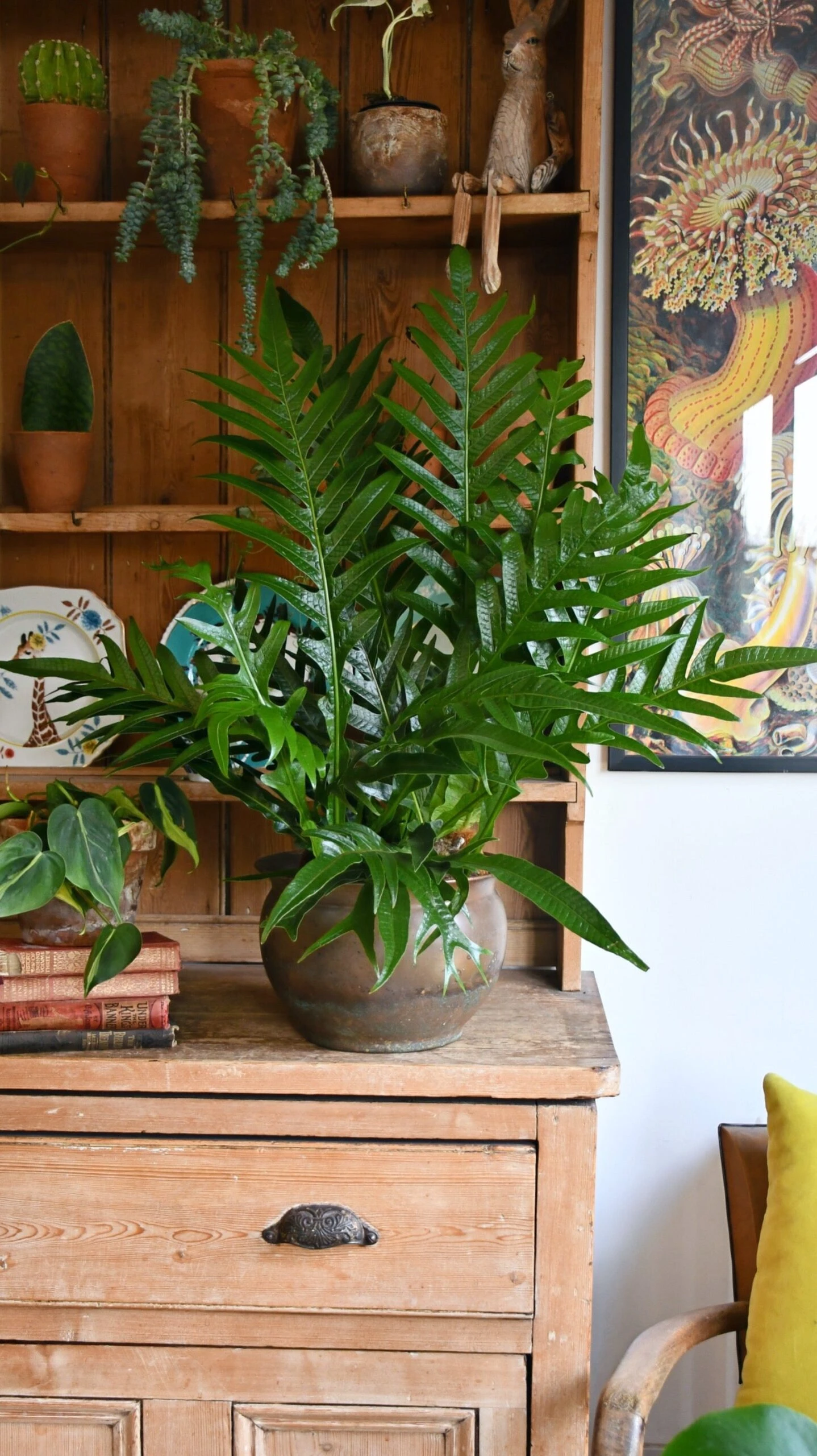 Aglaomorpha Coronans – Snake Leaf Ferns are wonderful and very much in fashion. We love this because it conjures up images of the lush rainforest floor (and Dinosaurs!). Aglaomorpha Coronans is in our view the prettiest of all the indoor ferns, with glossy large leaves and classically shaped leaves. These are relatively slow growers so we only sell the large mature form which shows the fern in all its glory.