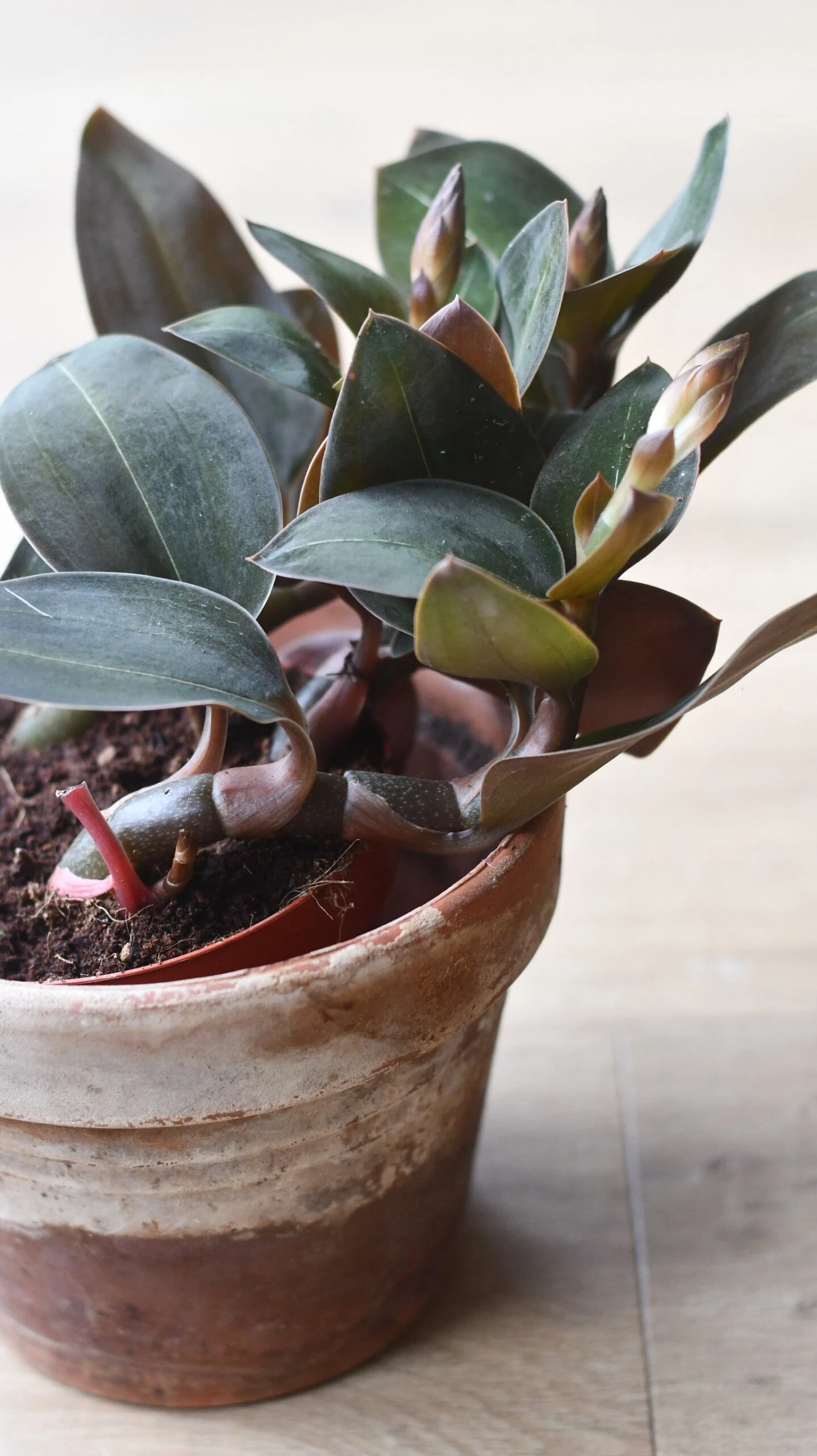 This orchid features glossy, elliptical leaves that grow in a compact rosette form, making it an ideal choice for those seeking a low-maintenance yet visually stunning plant. The leaves’ deep, almost black colour adds a touch of luxury to your interior decor, creating a luxurious ambience.