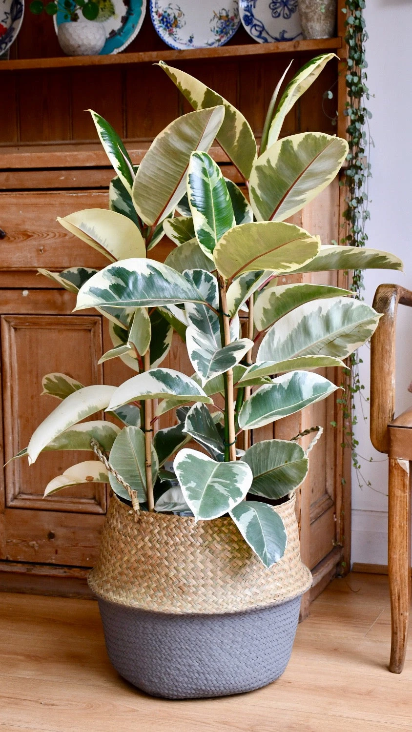 This large houseplant will be a wonderful focal point in your home – place it in any room where you want to add a touch of colourful rainforest style! Kitchen or bathroom, hall or study – this Variegated Rubber plant will thrive away from the direct sun of a window, but in bright light. Think of the light in the rainforest – bright but shaded by the tree canopy!Â