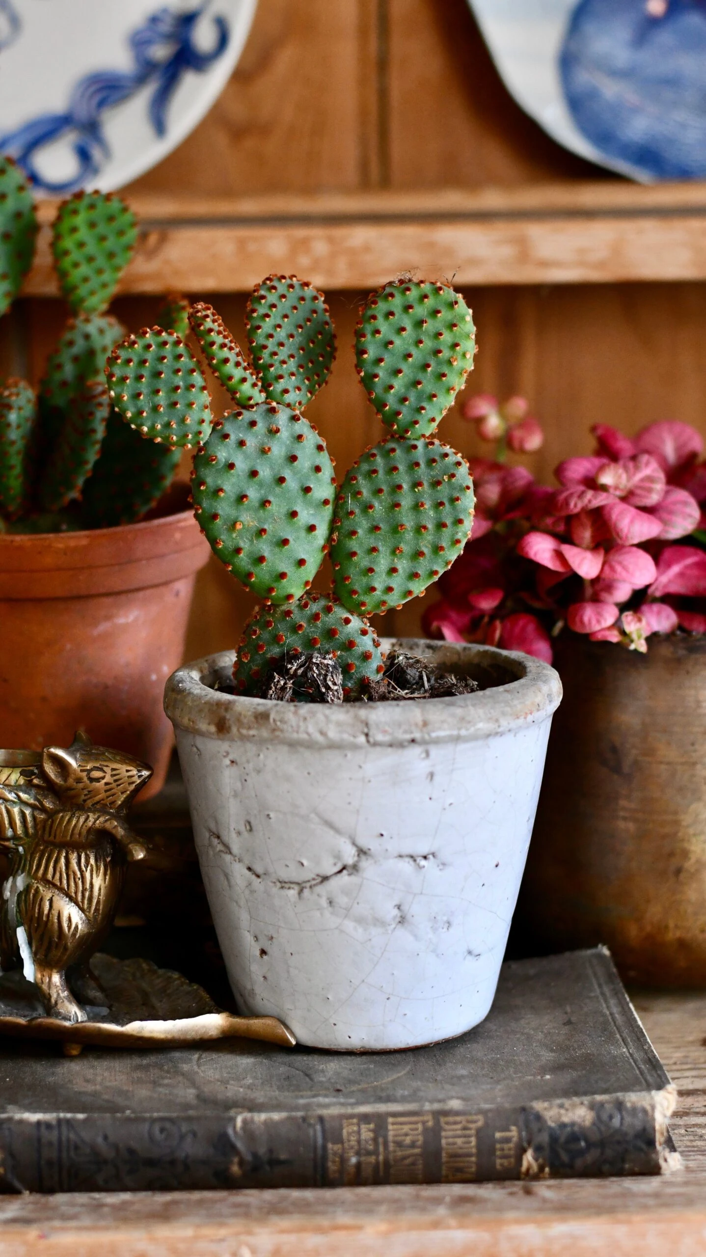 The species makes up for its total lack of spines with a profusion of red-brown glochids which it sheds with abandon and is a menace to any gardener. Whether it’s true or not the glochids have the reputation of detaching and flying on the wind and can blind cattle. Â