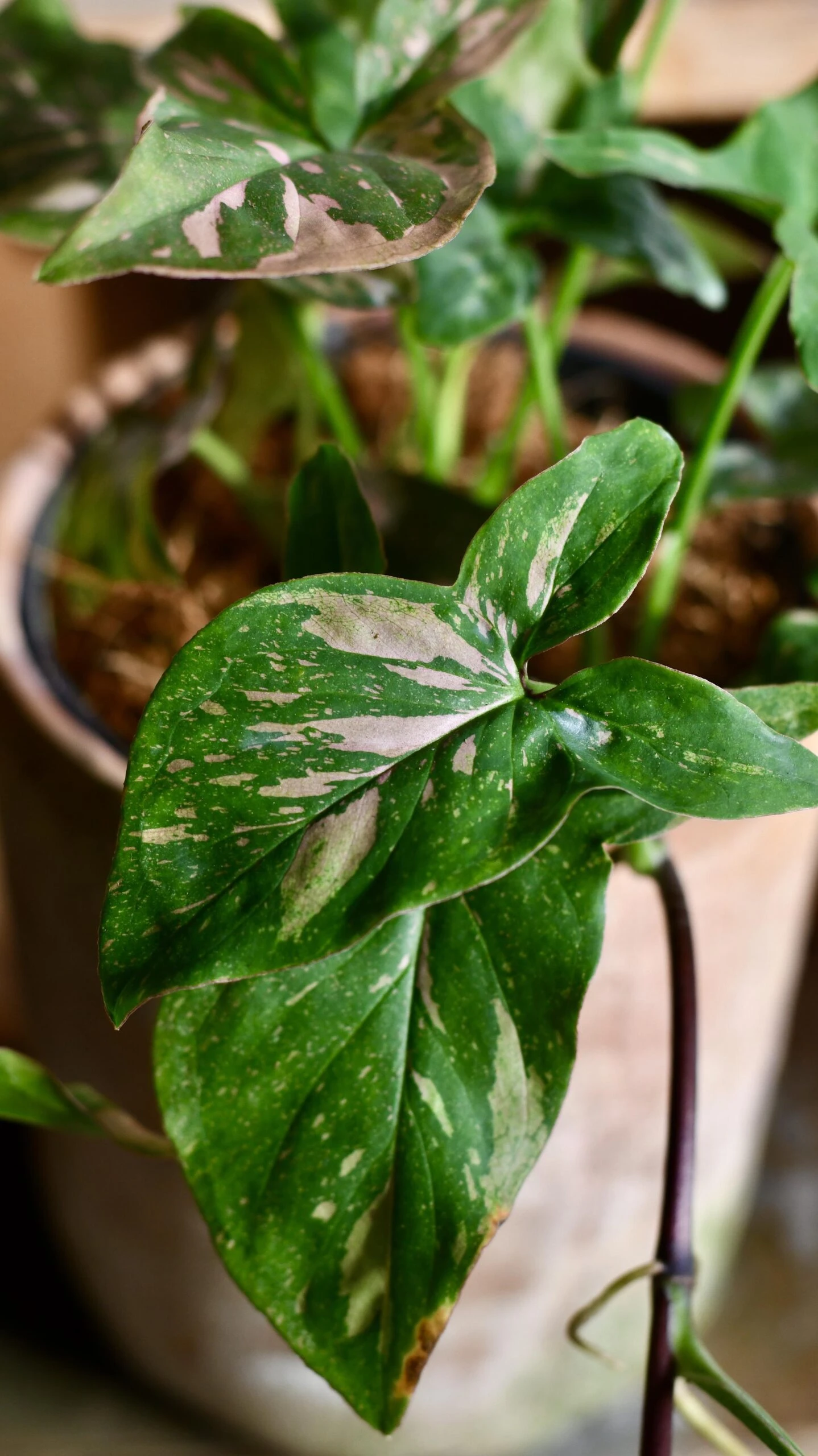 Syngonium Podophyllum Pink Splash Feeding: During the active growing season in spring and summer, feed the Syngonium Podophyllum Red Spot once a month with liquid plant food. You can try our own vegan, organic plant food for optimal results.