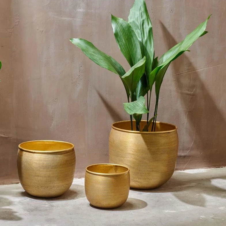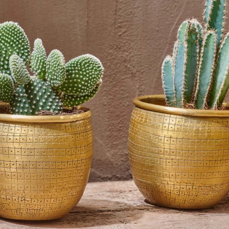 Planting has never looked so striking with our Tembesi collection of planters. Handcrafted from aluminium and finished in a warm brass hue, the collection is ideal for house plants, cacti and succulents. The etched detailing on the exterior is all made by hand and gives this eye–catching collection a real point of difference.